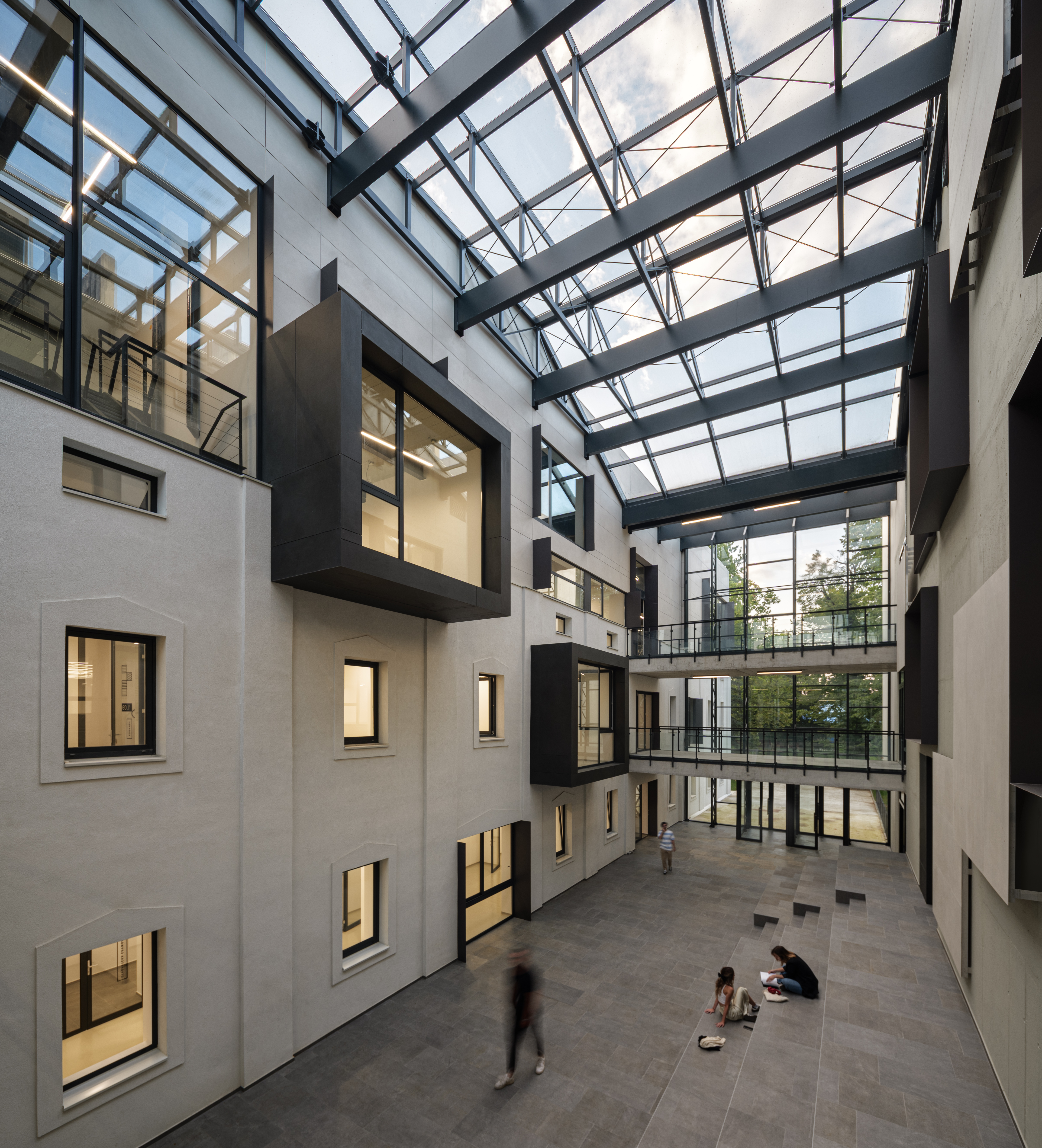 Betonske površine (fasadni plaštevi, stubovi, ploče, atike, unutrašnji zidovi i stepenišni traktovi) ostavljeni su bez maskiranja. U spoju sa staklom i čelikom, nastaje iskren, minimalistički ambijent: učionice, ateljei i holovi djeluju otvoreno i profesionalno, dok je robustnost materijala stalni podsjetnik na konstruktivnu logiku zgrade. Vidljivi beton ovdje nije „surov“, nego disciplinovan: ritam dilatacija, ujednačenost pora i spojeva, precizno rješeni uglovi i sjene — sve to gradi vizuelni identitet koji studentima arhitekture i građevine svakodnevno „predaje“ lekciju o materijalu, spoju i detalju.